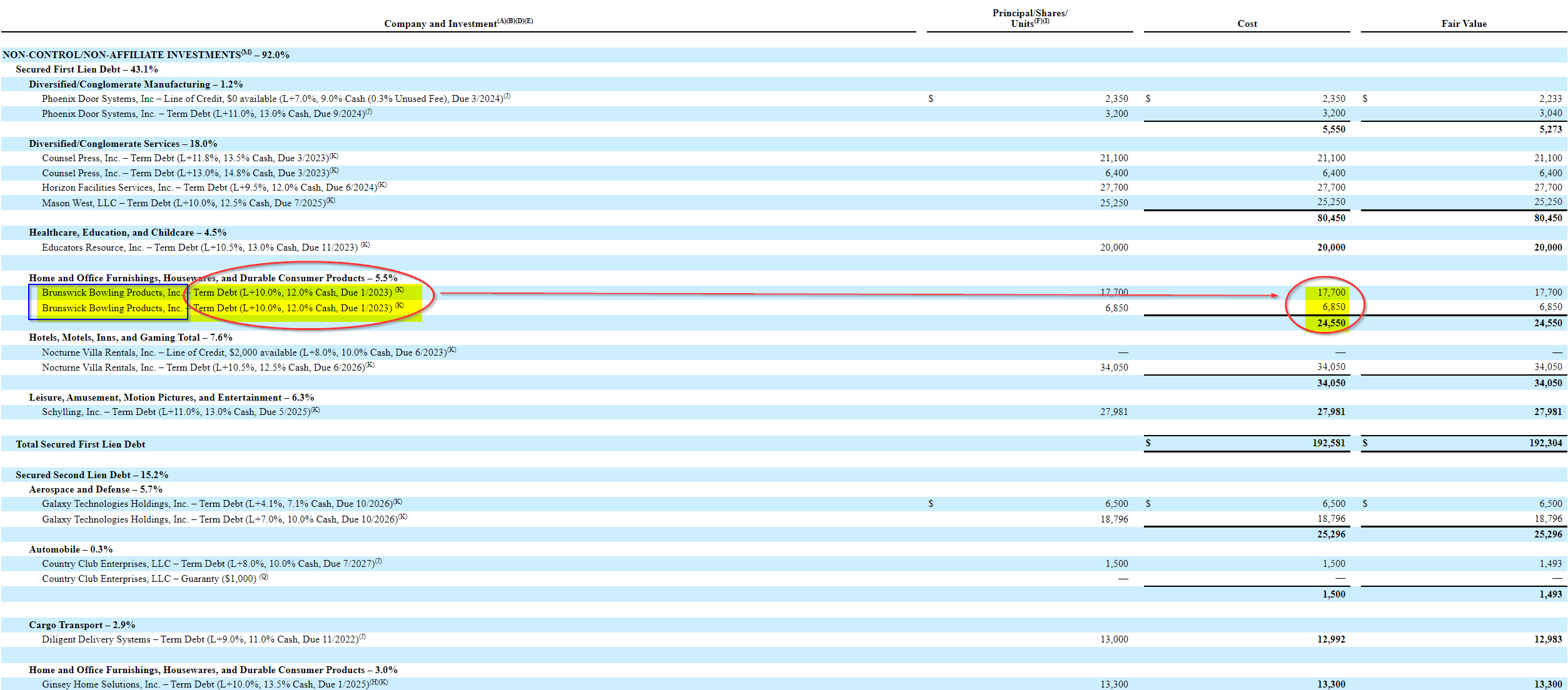 For example, look at the page above that shows that 5.5% of the portfolio was in term loans made to Brunswick Bowling Products at Libor plus 10%, along with some equity shares in the company. In fact, many of the loans have floating rate interest rates based on LIBOR plus a spread ranging from 4% to 10%, plus equity kickers.Â
