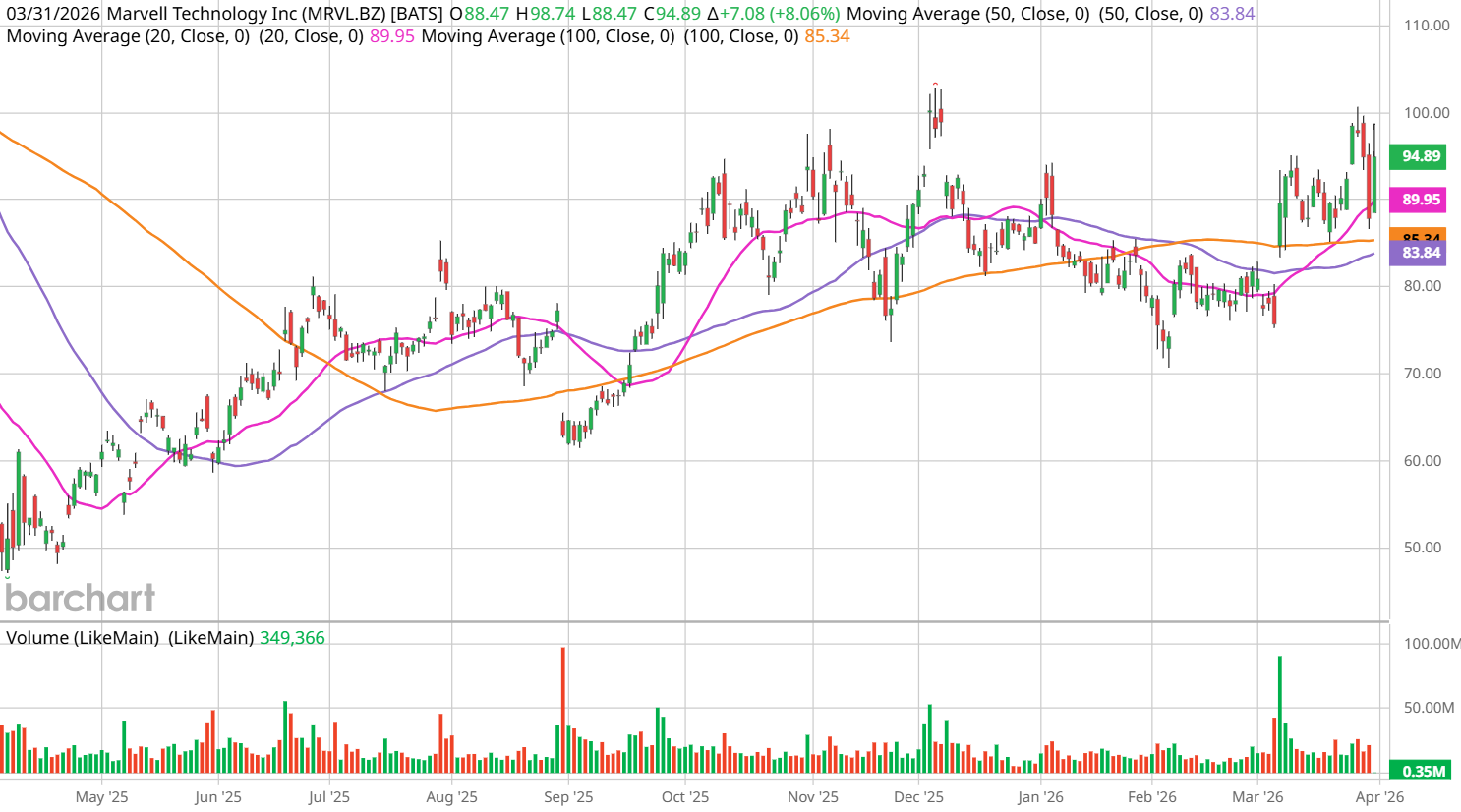 From a fundamental standpoint, Marvell delivered record fiscal 2026 revenue of $8.195 billion, representing 42% year-over-year growth, with earnings per share (EPS) climbing 81%. Management has guided fiscal 2027 revenue above $11 billion, with data center revenue expected to grow roughly 40% year-over-year and sequential acceleration in each quarter. Design wins and bookings are at all-time highs, and Q1 fiscal 2027 revenue guidance of $2.4 billion at the midpoint signals strong forward visibility.