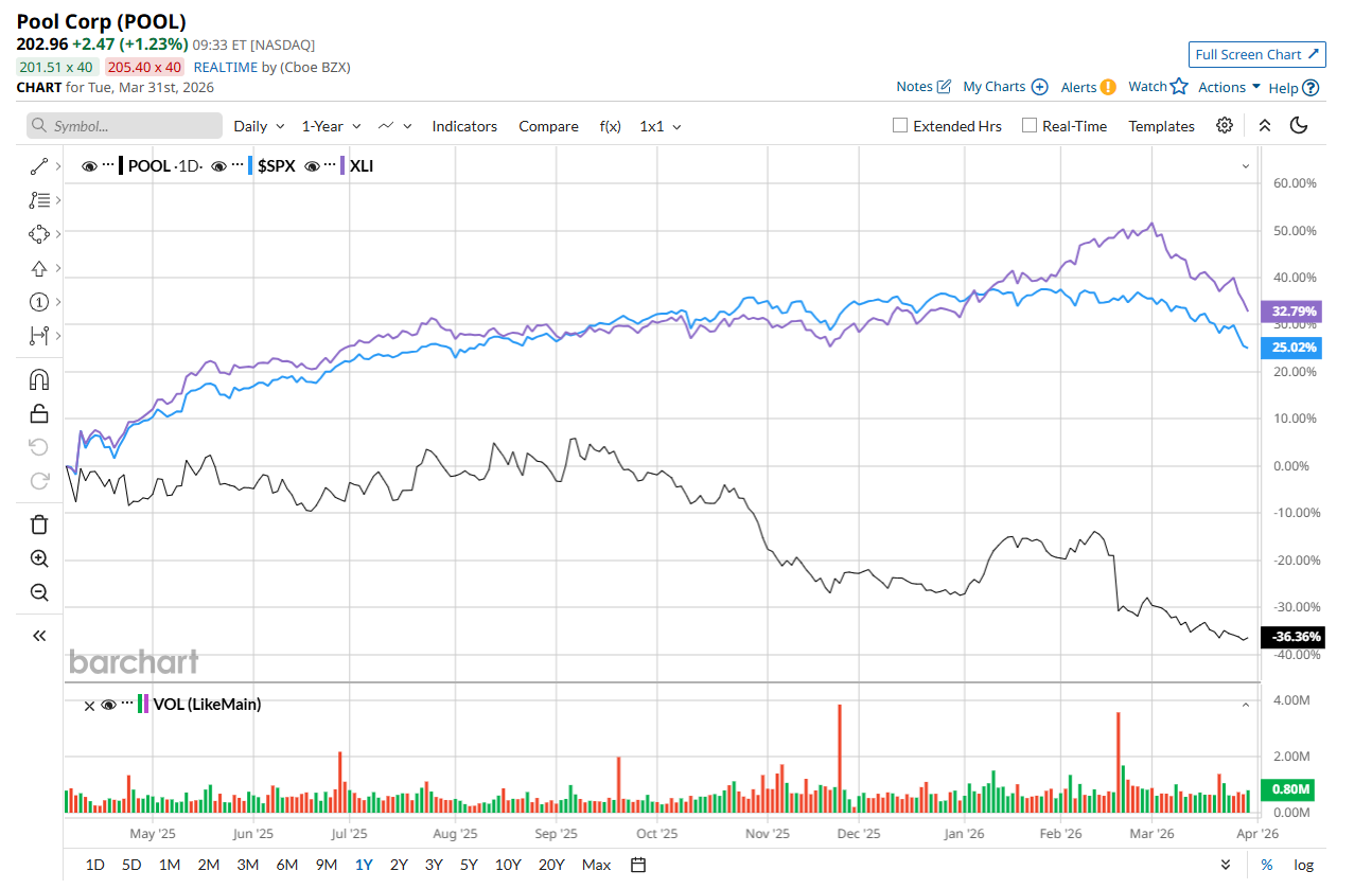 Shares of POOL have declined 36% over the past 52 weeks, notably trailing both the S&P 500 Index's ($SPX) 13.7% return and the State Street Industrial Select Sector SPDR ETF’s (XLI) 20.3% uptick over the same time period.