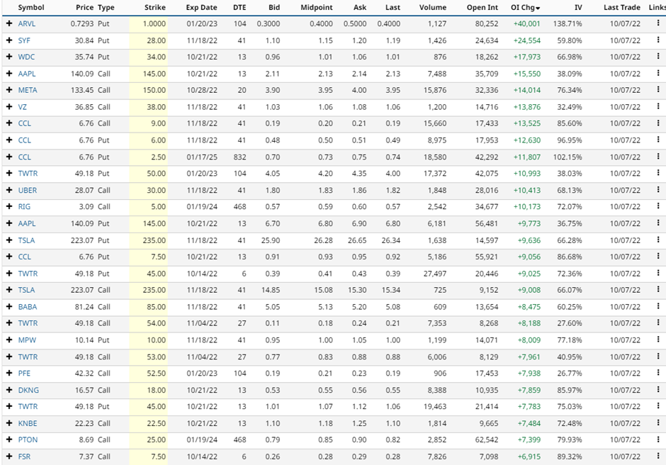 Western Digital (WDC), Apple (AAPL), Meta Platforms (META), Verizon (VZ), Carnival (CCL), Twitter (TWTR) and Uber (UBER) saw some of the largest changes in open interest last week.
