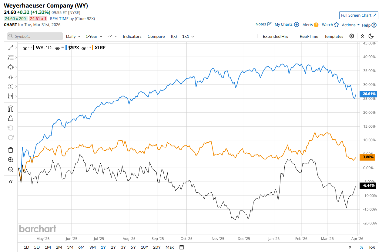 WY stock has declined 16.4% over the past 52 weeks, lagging behind the S&P 500 Index’s ($SPX) 15% rise and the State Street Real Estate Select Sector SPDR ETF’s (XLRE) 2% decline during the same time frame.