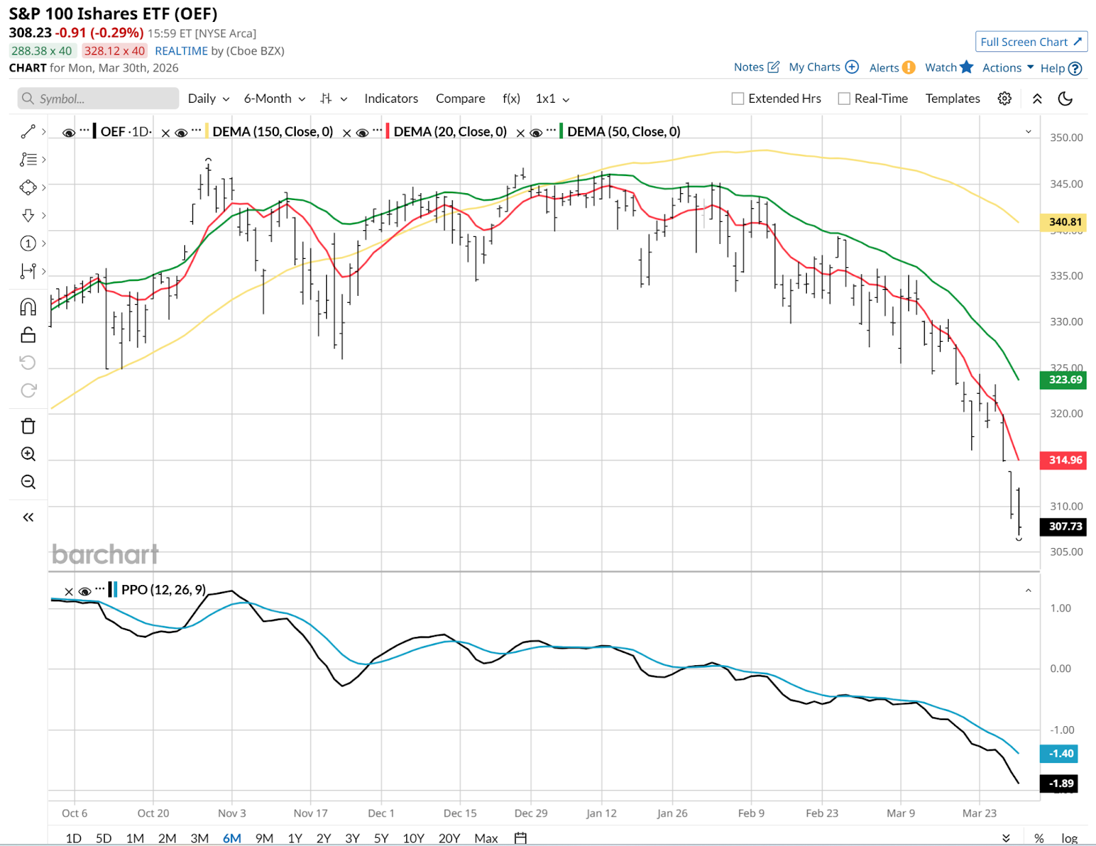 Here’s the S&P 100 ETF (OEF) over the past six months. During that time, we’ve seen all three of the moving averages I typically show in my charts (20-day, 50-day, 150-day) roll over. That’s a terrible look for investors aiming to make positive returns.