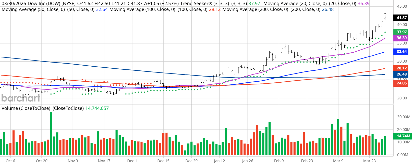 I found today’s Chart of the Day by using Barchart’s powerful screening functions to sort for stocks with the highest technical buy signals; superior current momentum in both strength and direction; and a Trend Seeker “buy” signal. I then used Barchart’s Flipcharts feature to review the charts for consistent price appreciation. DOW checks those boxes. Since the Trend Seeker issued a new “buy” on Dec.10, DOW stock is up 73.04%.