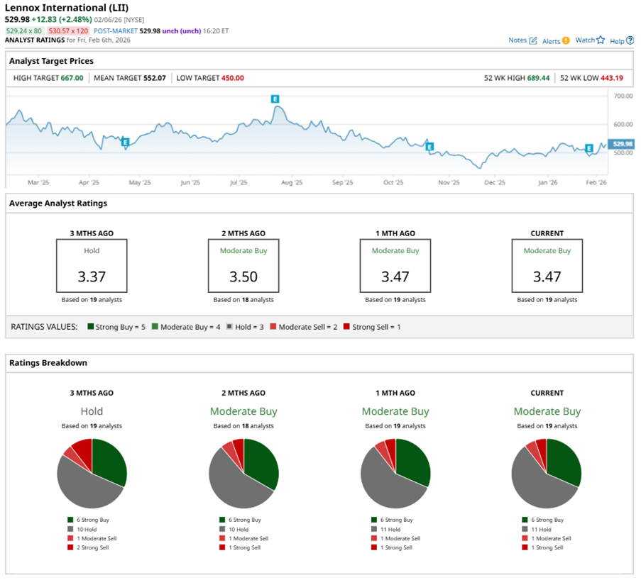 Among the 19 analysts covering LII stock, the consensus is a “Moderate Buy.” That’s based on six “Strong Buy” ratings, 11 “Holds,” one “Moderate Sell,” and one “Strong Sell.”