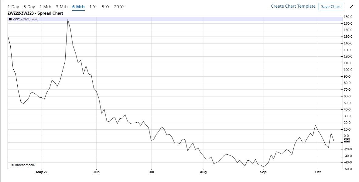 Looking at the year-over-year December spread of wheat, we can see the large swings this spread has made during the previous six months. Until July, the spread was in backwardation (front-month contract price higher than a back-month contract). From July to October, the market stayed in contango (near-month priced lower than a back-month). Now the spread is trying to close above the zero line and go into backwardation again. If this happens, wheat could make another bullish move.