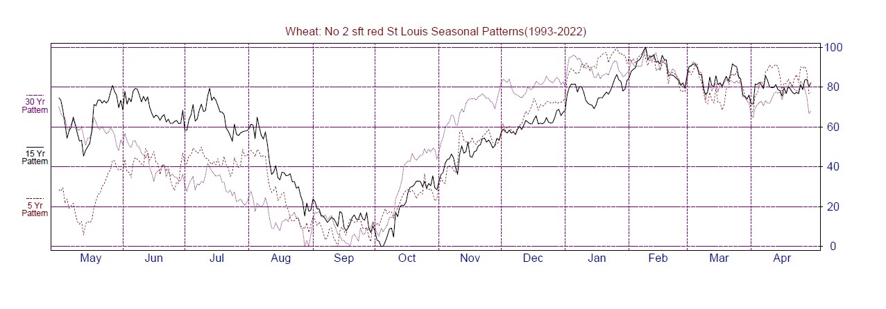 I find using seasonal patterns properly requires additional technical or fundamental analysis. MRCI's seasonal pattern of the cash wheat market reveals not only the 15-year average but the 5 and 30-year average, making a solid seasonal low in early October. The wheat market already has a daily uptrend supporting this seasonal pattern. What else could help support MRCI's seasonal research?