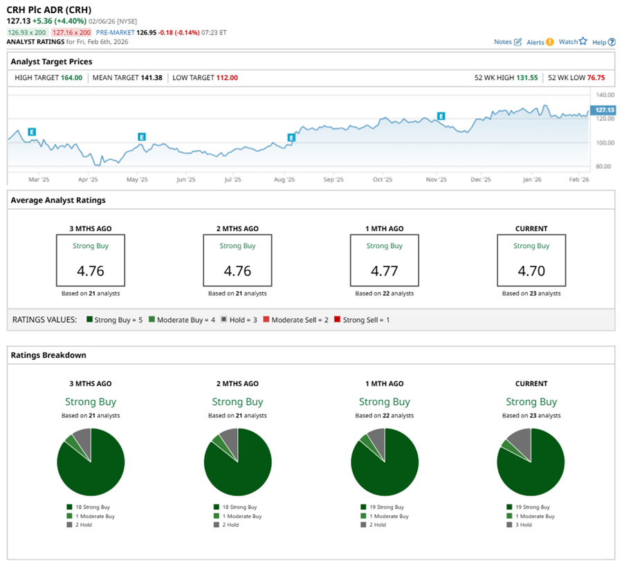 The mean price target of $141.38 represents an 11.2% premium to CRH’s current price levels. The Street-high price target of $164 suggests an ambitious upside potential of 29%.