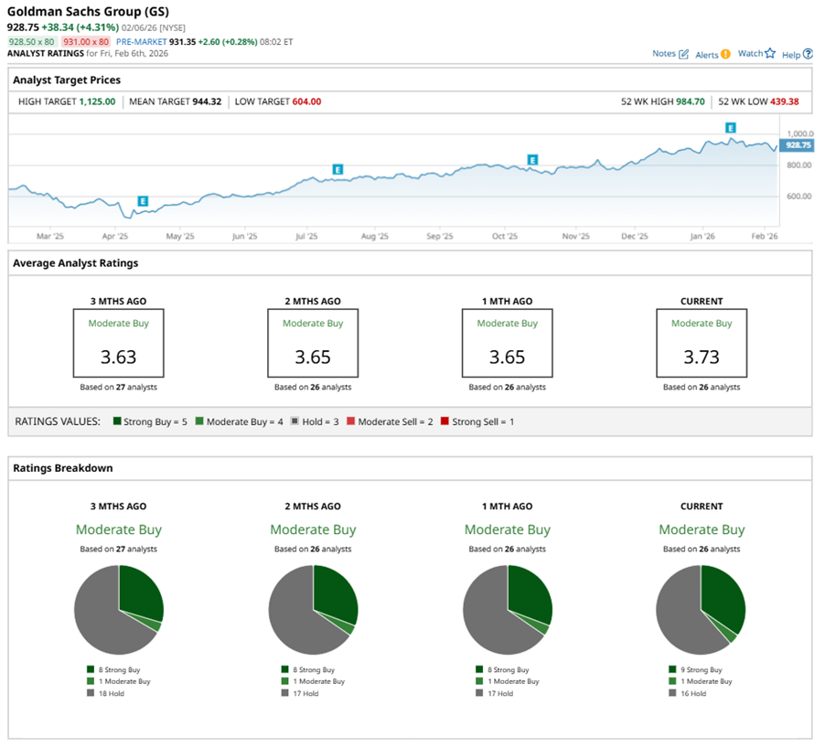 On Feb. 4, UBS kept a “Neutral” rating on GS and raised the price target to $990, implying a potential upside of 6.6% from current levels.