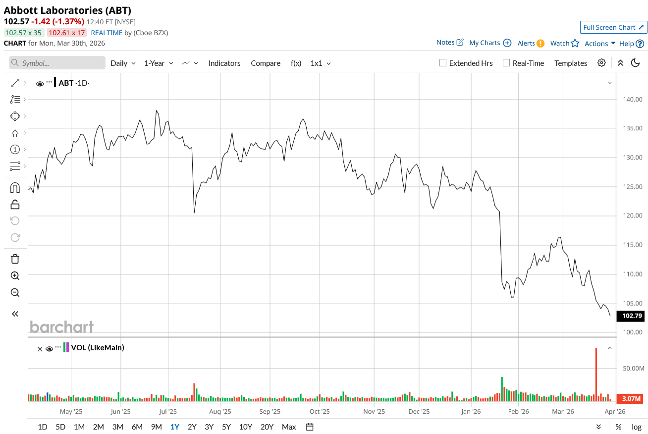 Take Abbott Laboratories (ABT). The stock sits 26% below its 52-week high of $139.06, trading near $102 per share. When will it bounce back? The short answer: the fundamentals already point higher, and the pullback looks more like a buying window than a warning sign.