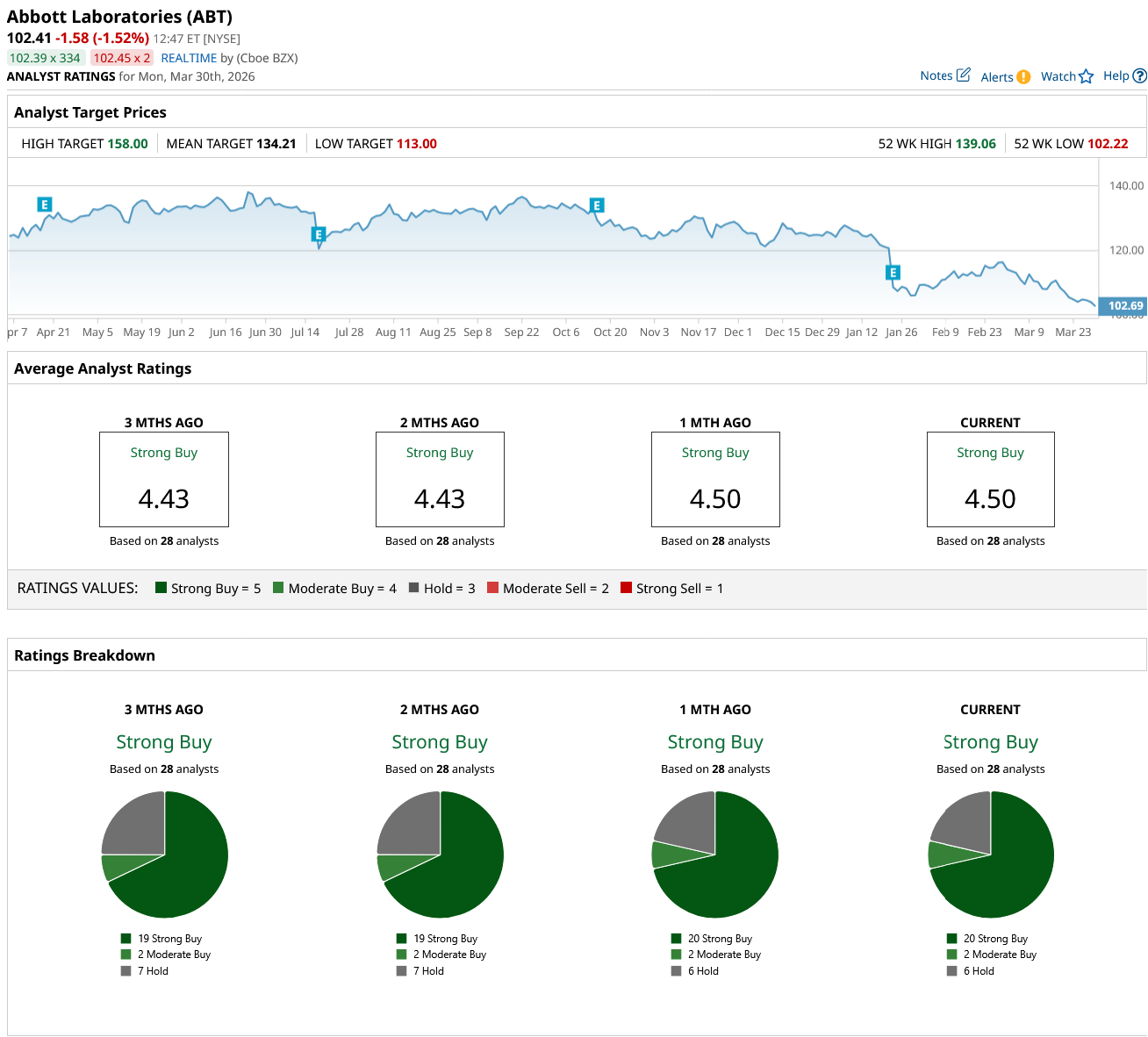 Analysts agree. Of 28 firms covering ABT stock, 20 rate it a "Strong Buy," giving it a similar consensus rating. Two analysts rate the stock a "Moderate Buy," and six say "Hold." There are no "Sell" ratings in the mix. The average 12-month price target of $134.21 implies roughly 32% upside potential from $102. High targets reach $158; the low sits at $113.
