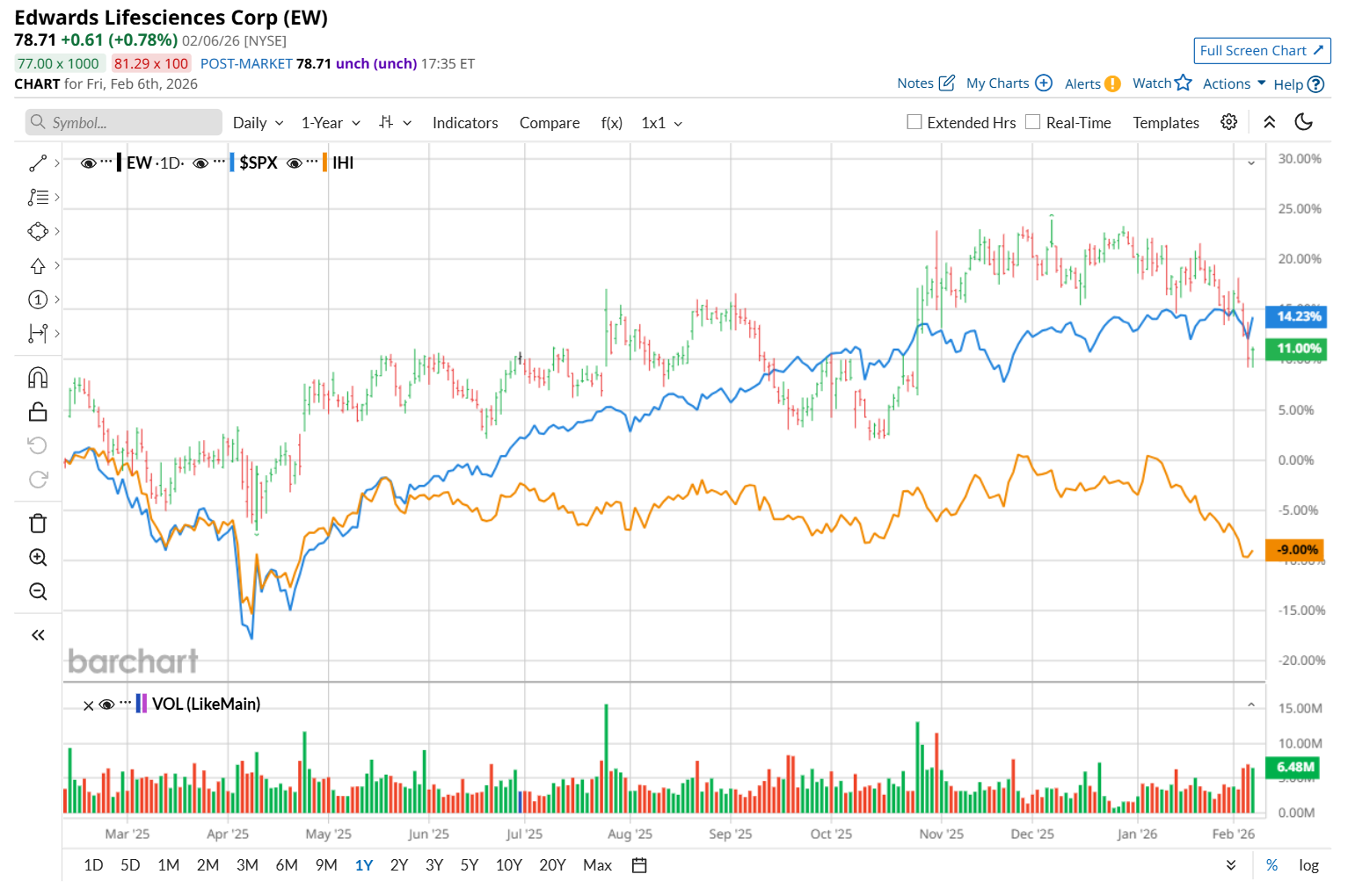 However, zooming in further, EW has outpaced the iShares U.S. Medical Devices ETF (IHI), which declined 8.9% over the past 52 weeks and 6.1% on a YTD basis.