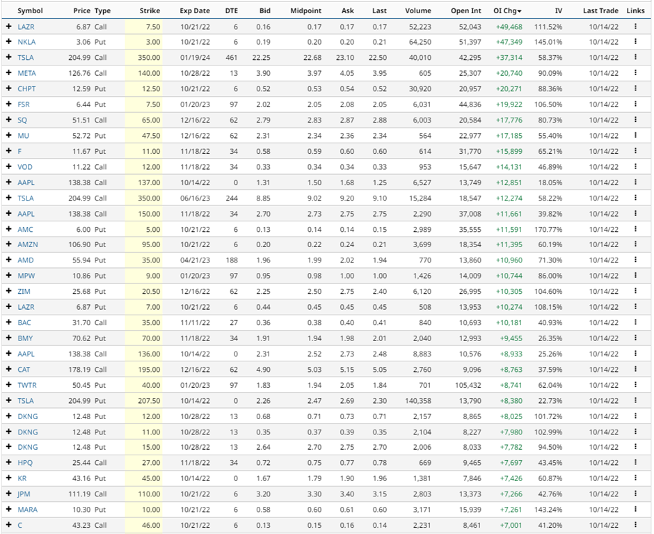 Nikola (NKLA), Tesla (TSLA), Meta Platforms (META), Chargepoint (CHPT), Block Inc (SQ), Micron Technology (MU), Ford (F) and Apple (AAPL) saw some of the largest changes in open interest last week.