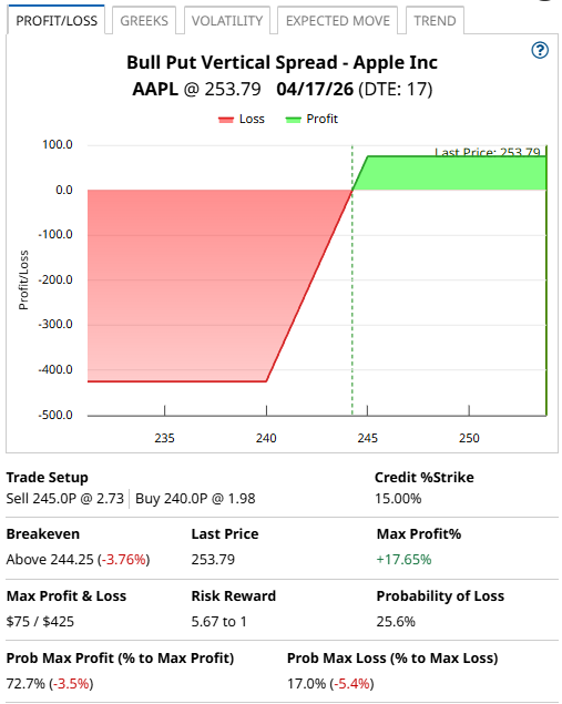 That represents a 17.65% return on risk between now and April 17 if AAPL stock remains above $245.