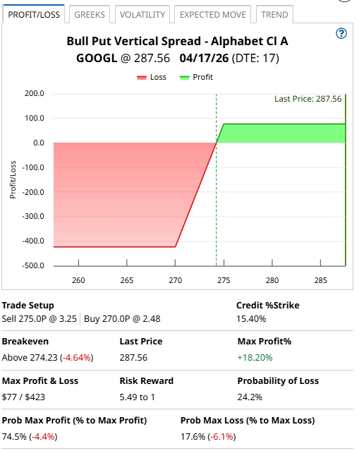 If GOOGL closes below $270 on the expiration date the trade loses the full $423.