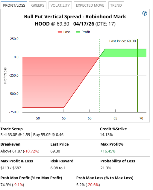 That represents a 16.45% return on risk between now and April 17 if HOOD stock remains above $63.