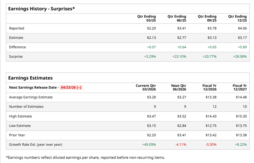 The Hartford Insurance Group, Inc. (HIG), headquartered in Hartford, Connecticut, provides insurance and financial services to individual and business customers. Valued at $37 billion by market cap, the company offers products include property and casualty insurance, group benefits, and mutual funds. The insurance giant is expected to announce its fiscal first-quarter earnings for 2026 after the market closes on Thursday, Apr. 23.