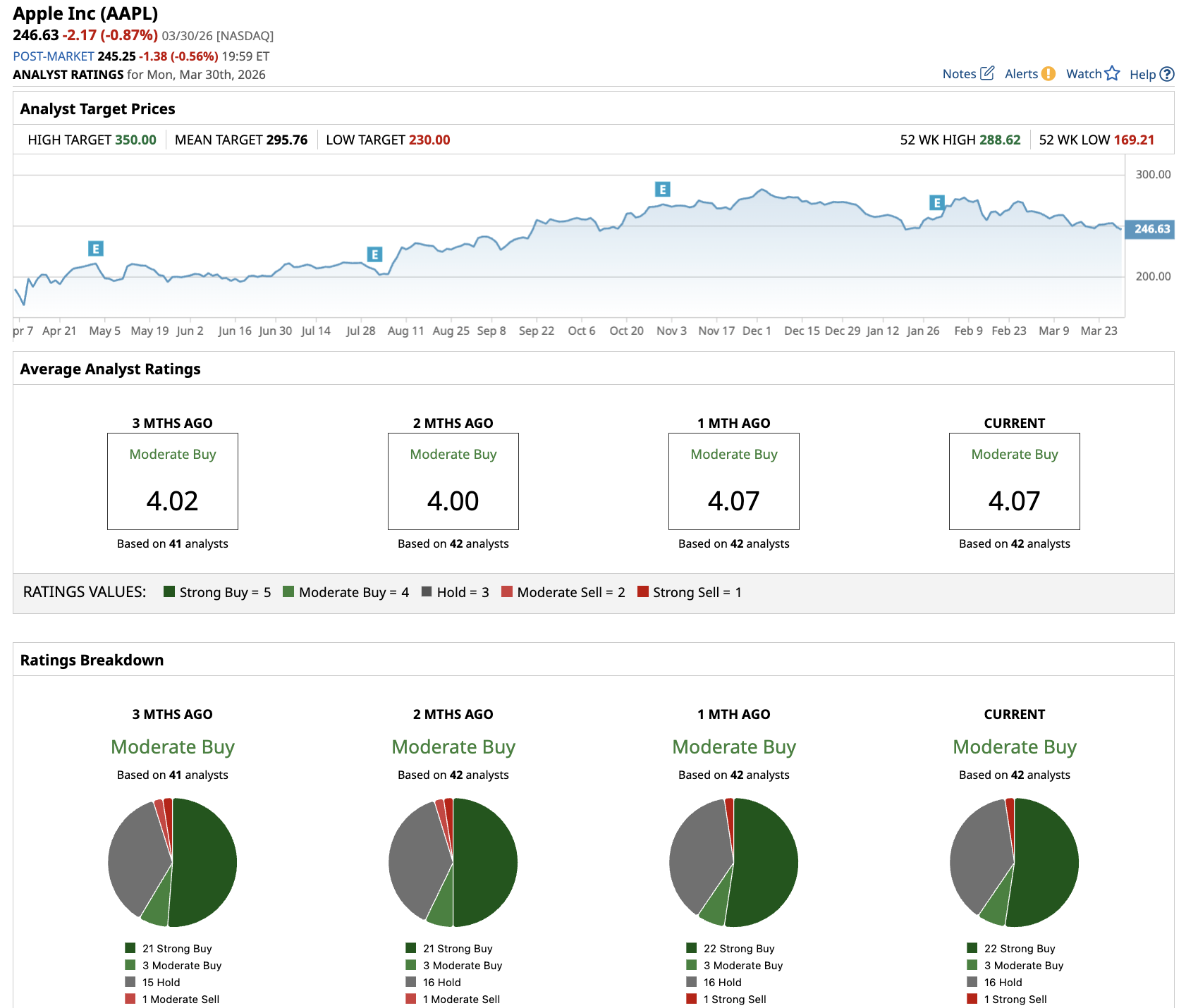 Out of the 42 analysts covering AAPL stock, 22 recommend “Strong Buy,” three recommend “Moderate Buy,” 16 recommend “Hold,” and one recommends “Strong Sell.” The average AAPL stock price target is $295.76, above the current price of about $247.