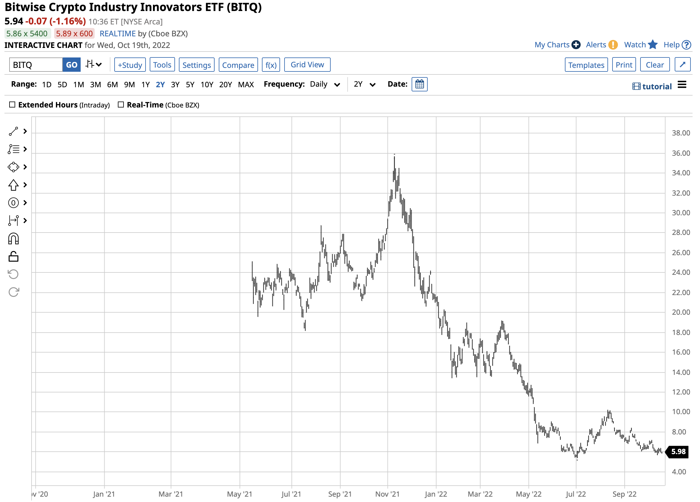 The chart shows BITQ rose to a $35.68 per share high in November 2021 when Bitcoin and Ethereum rallied to record peaks. The ETF fell to a low of $5.39 in early July, just after the leading cryptos reached the most recent bottoms. BITQ fell 84.9% over the period.Â