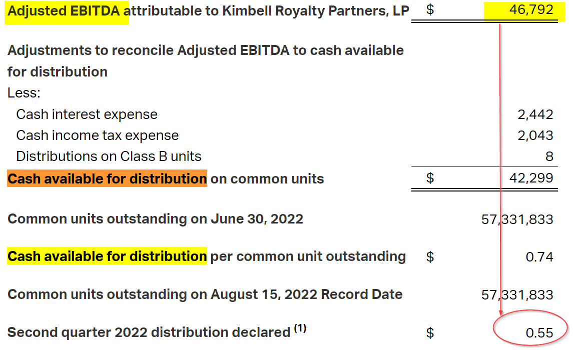 The reason is the company bases its cash available for distribution on adjusted EBITDA (earnings before interest, taxes, depreciation and amortization), a cash flow measure. Kimbell also deducts cash interest and taxes from this metric: