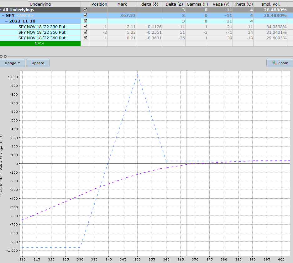 On SPY, a November expiry broken wing butterfly could be set up through buying the 360 put, selling two of the 350 puts and buying the 330 put.