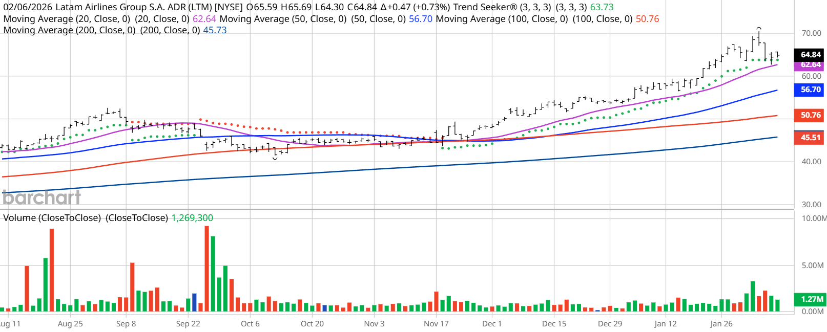 LATAM Airlines scored a 52-week high of $70.42 on Feb. 3.