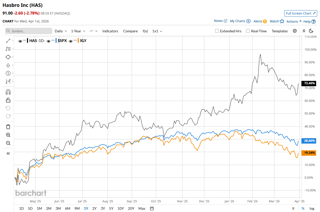 HAS stock has surged 46.2% over the past 52 weeks, outperforming the S&P 500 Index’s ($SPX) 17% rise and the State Street Consumer Discretionary Select Sector SPDR ETF’s (XLY) 10.6% return during the same time frame.