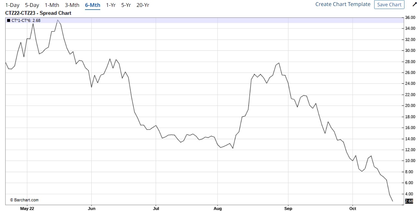 The year-over-year spread is very bearish for cotton. Closes back over the October highs would change the bearishness to more neutral.Â