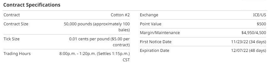 The December contract is trading at 77.50 US cents per pound, making the notional contract value $38,750. The required overnight margin is $4,500 per contract resulting in leverage of 8.6:1.Â