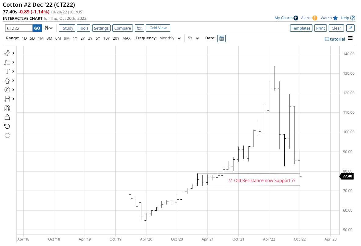 Technically the cotton market looks weak and not ready to be bought. One area of interest for a possible reversal is the monthly chart (above) area of consolidation and then a breakout from April 2021. Could this old resistance now become support when the price returns? We surely cannot tell the way that price is retracing.Â