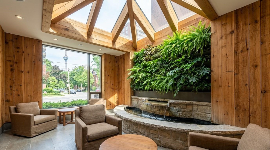 A biophilic residential lobby in Toronto, where natural materials, indoor plants, and daylight create an immediate sense of wellness.