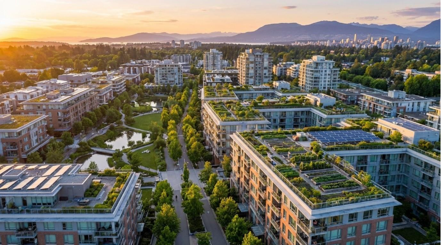 Aerial view of a Canadian mixed-use development integrating extensive green rooftops, community gardens, and park corridors into the urban fabric.
