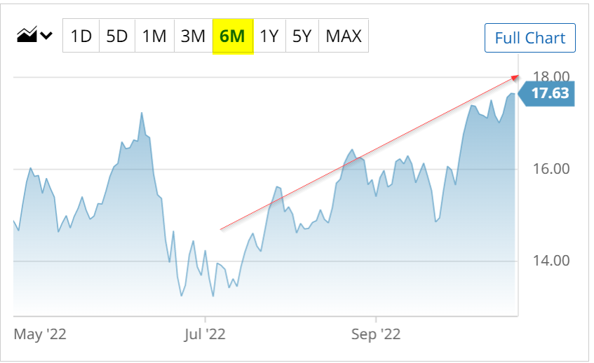 On Oct. 19, the company set its quarterly dividend at 45 cents per share, up from 42 cents last quarter. That gives investors a prospective $1.80 annual dividend or 10.2% of its price of $17.63 on Oct. 20. This is a 7% increase over the prior quarter and an 80% hike over last's years' quarterly dividend.Â