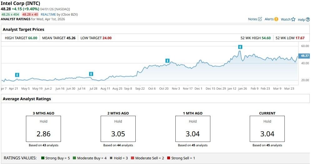 At the time of writing, the consensus rating on INTC stock is “Hold," with the mean price target of about $45 indicating potential downside of some 7% from here.