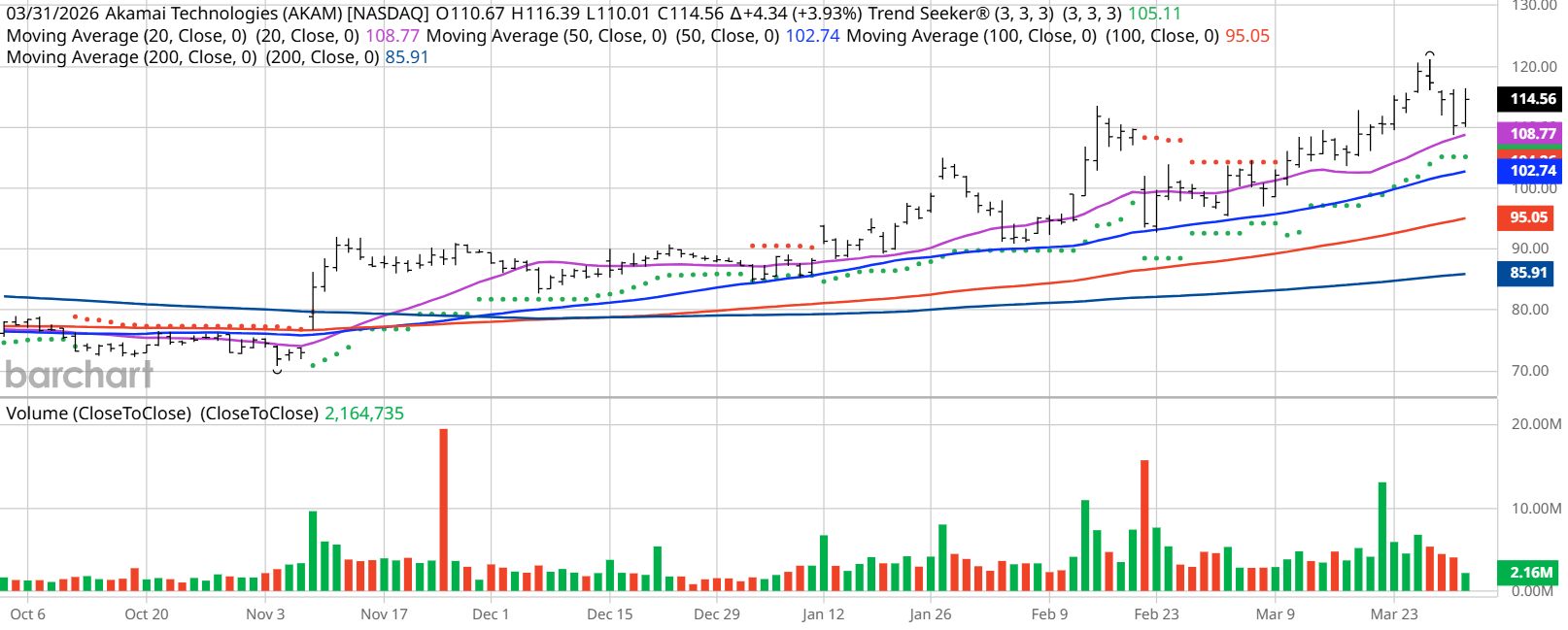 I found today’s Chart of the Day by using Barchart’s powerful screening functions to sort for stocks with the highest technical buy signals; superior current momentum in both strength and direction; and a Trend Seeker “buy” signal. I then used Barchart’s Flipcharts feature to review the charts for consistent price appreciation. AKAM checks those boxes. Since the Trend Seeker issued a new “buy” on March 10, AKAM stock is up 10.77%.