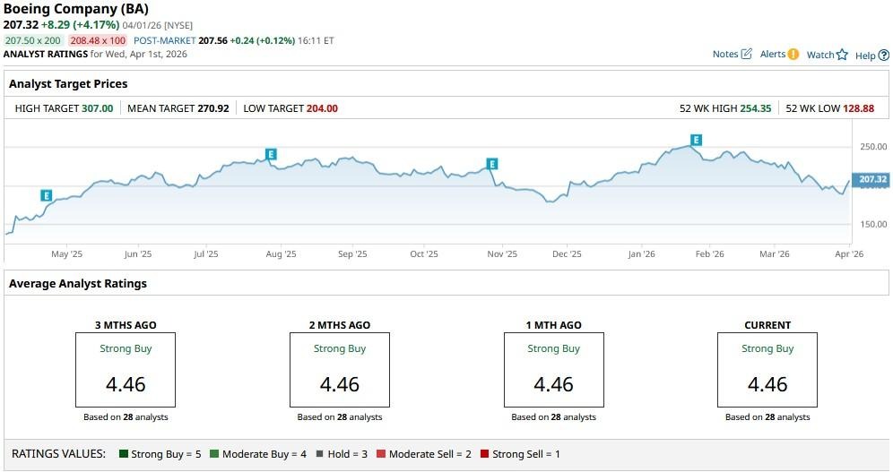 According to Barchart, the consensus rating on BA stock sits at “Strong Buy” currently, with the mean price target of $271 indicating potential for another 31% rally from here.