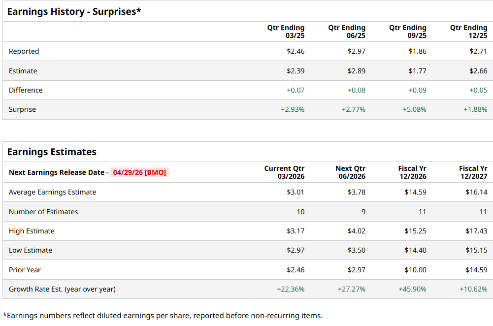 The drug giant is expected to announce its fiscal first-quarter earnings for 2026 on Wednesday, April 29, before the market opens. Ahead of the event, analysts expect ABBV to report a profit of $3.01 per share on a diluted basis, up 22.4% from $2.46 per share in the year-ago quarter. The company has consistently surpassed Wall Street’s EPS estimates in its last four quarterly reports.