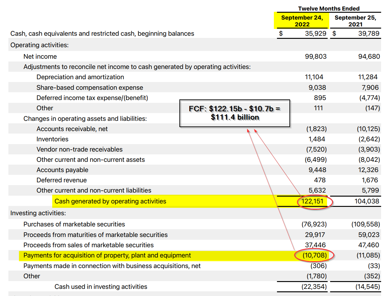 For the past fiscal year ending Sept. 24, Apple's operating cash flow was $122.5 billion and FCF was $111.4 billion. That can be seen on page 3 of the company's financial results in the cash flow statement. That FCF represents 28.3% of its $394.3 billion in full-year revenue.