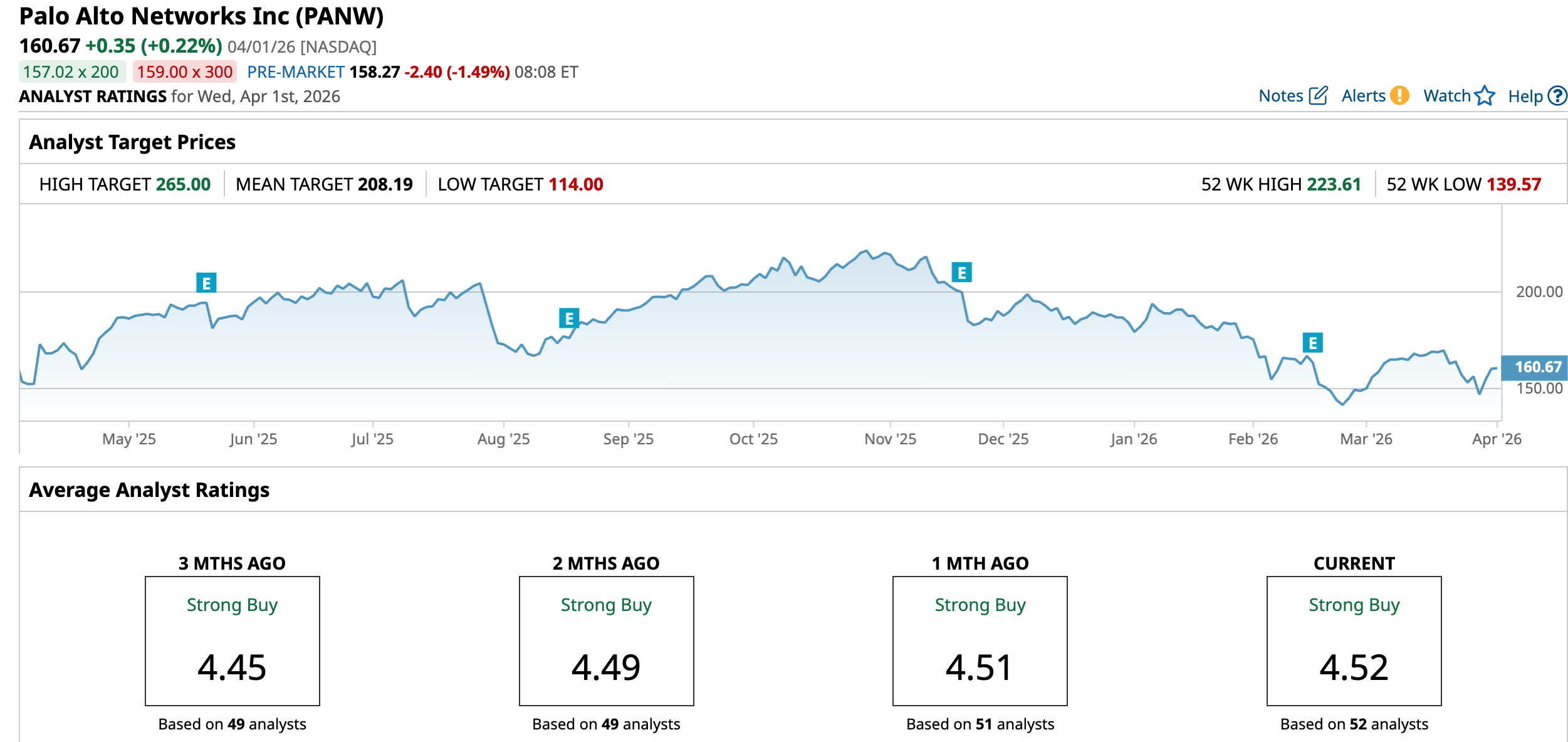 Palo Alto Networks is going through a tough time on Wall Street as its FY2026 forecast has weighed on sentiment. Moreover, the company’s aggressive acquisition spree has created concerns about its margin growth. Over the past 52 weeks, Palo Alto Networks’ stock has declined by 6.2%, and it is down 12.77% year-to-date (YTD). However, the stock is up 4.86% over the past five days due to its CEO’s purchase. Its shares reached a 52-week low of $139.57 on Feb. 24, but are up 15.12% from that level.