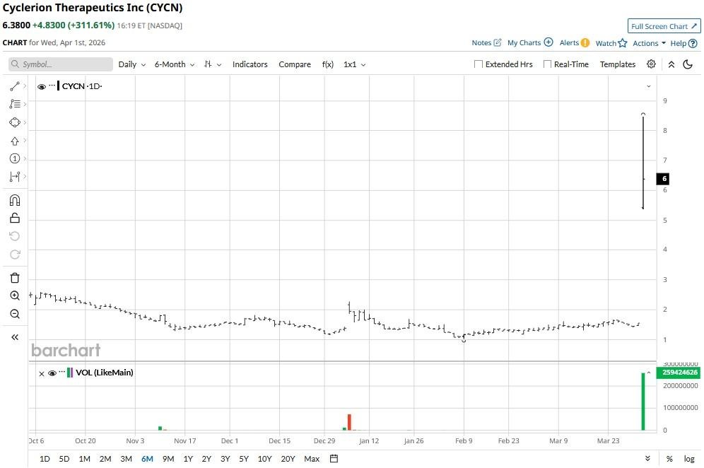 At the time of writing, Cyclerion stock is trading at nearly 6x its price in early February.