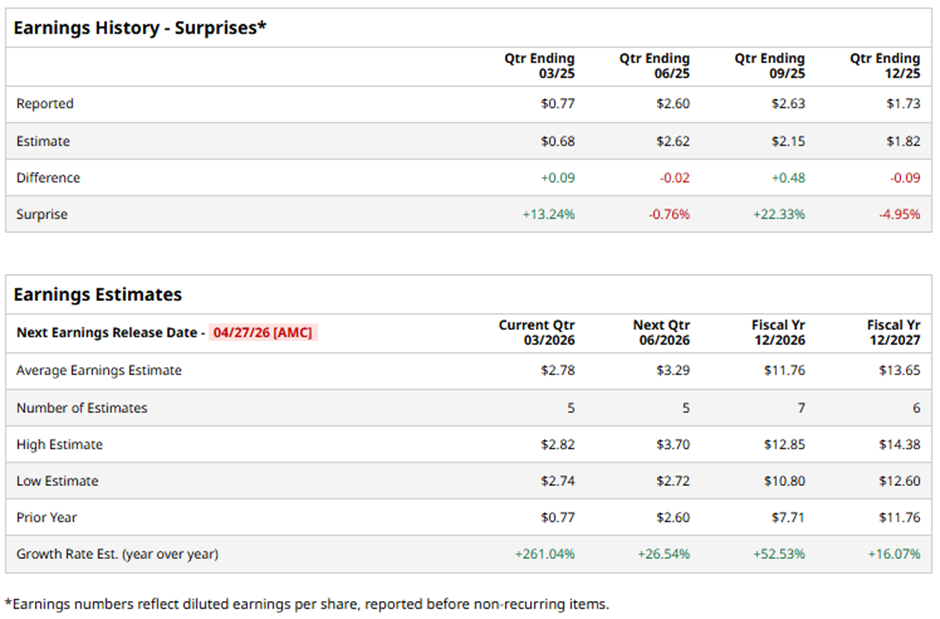 The Charlotte, North Carolina-based company is set to release its fiscal Q1 2026 results after the market closes on Monday, Apr. 27. Ahead of this event, analysts project NUE to report an adjusted EPS of $2.78, a surge of 261% from $0.77 in the year-ago quarter. It has exceeded Wall Street's earnings estimates in two of the last four quarters while missing on two other occasions.