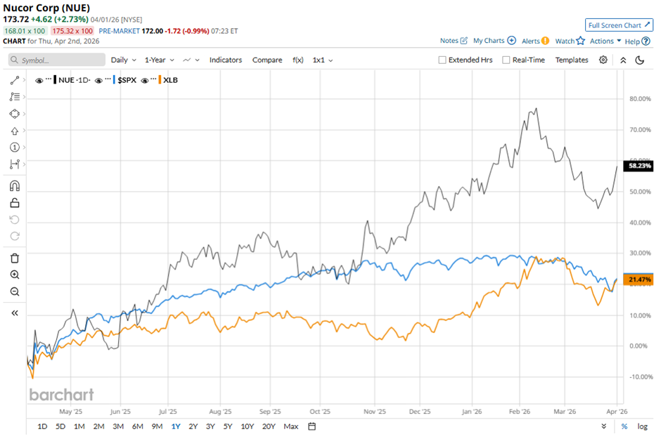 Over the past 52 weeks, shares of Nucor have increased 39.8%, outperforming the broader S&P 500 Index's ($SPX) 16.7% gain and the State Street Materials Select Sector SPDR ETF's (XLB) 14.4% return over the same time frame.