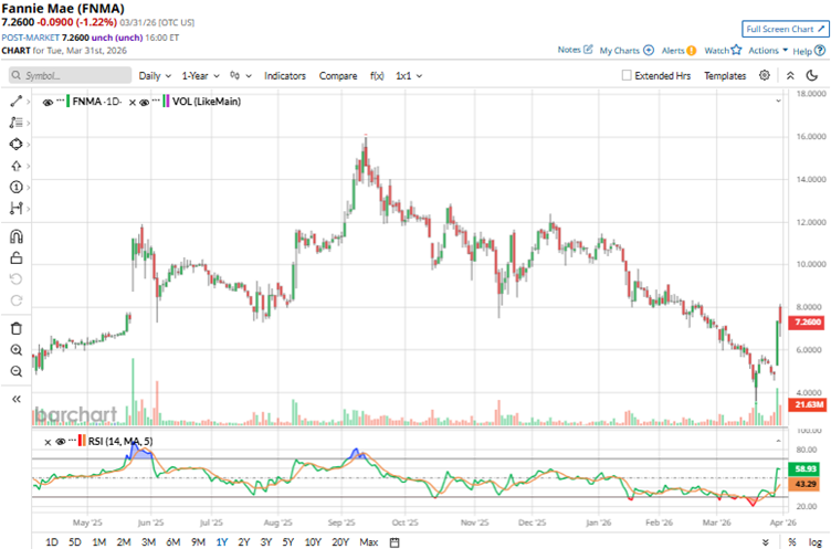 Fannie Mae’s stock has not recovered much since its crash during the 2008 financial crisis. More recently, mortgage rates have climbed amid war jitters, cooling the housing market and creating volatility in Fannie Mae’s stock price. Over the past 52 weeks, the stock has gained a modest 7.27%, while it is down 34% year-to-date (YTD).