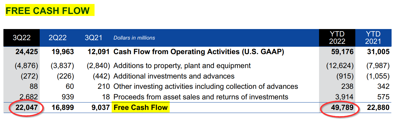 This was a result of the massive $22 billion in free cash flow (FCF) it produced during the quarter. That means Exxon has produced almost $50 billion in FCF YTD. It also represents $88 billion on an annualized basis.