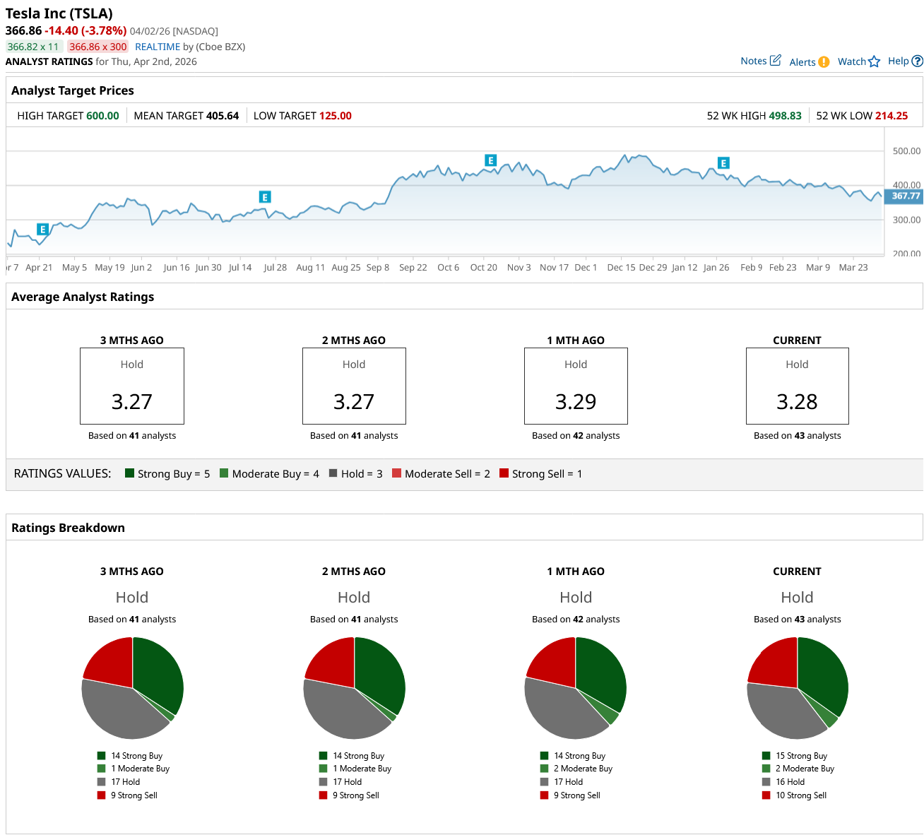 Out of the 43 analysts covering TSLA stock, 15 recommend “Strong Buy,” two recommend “Moderate Buy,” 16 recommend “Hold,” and 10 recommend “Strong Sell.” The average TSLA stock price target is $405.64, above the current price of about $366.