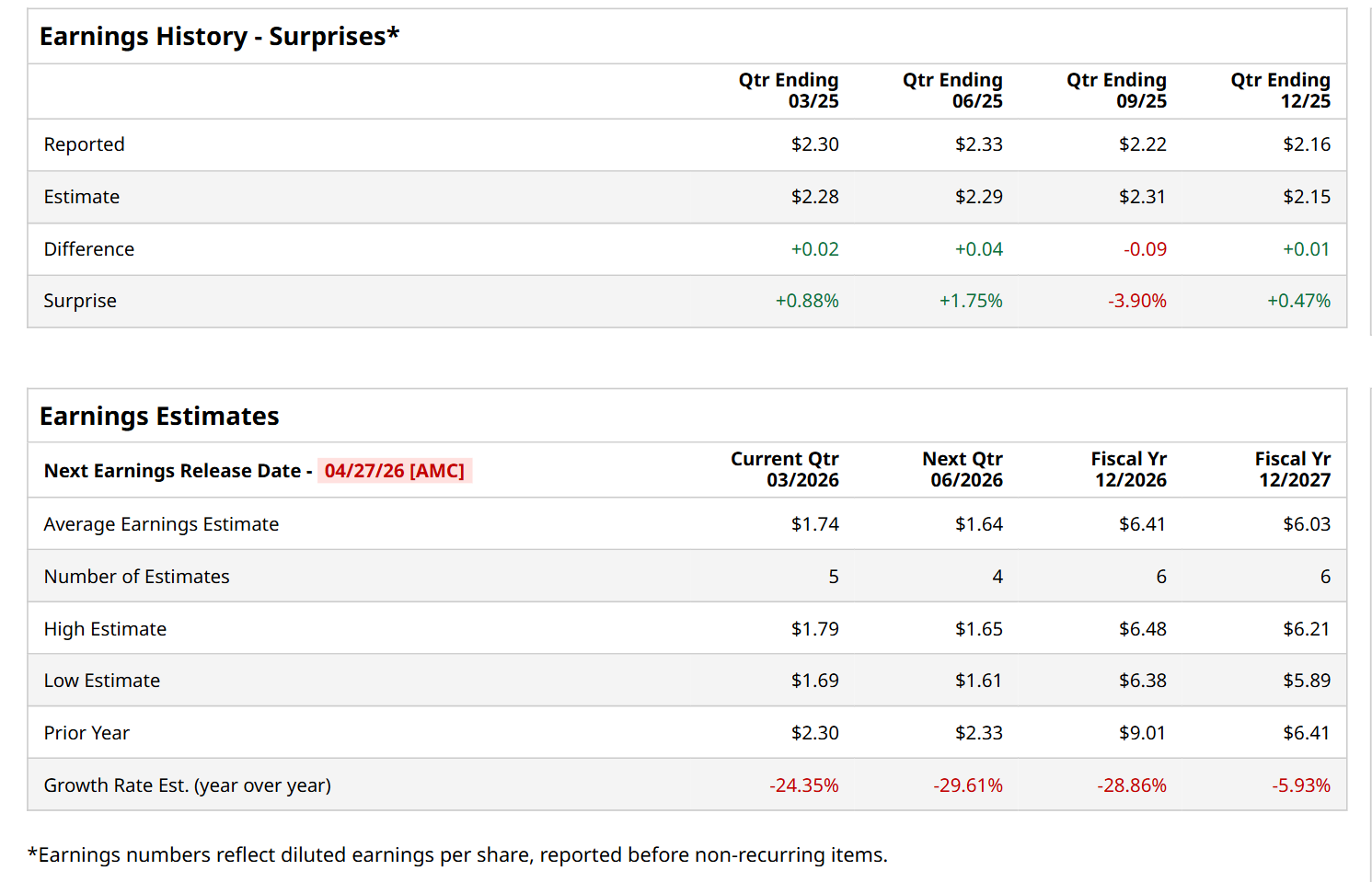 Ahead of this event, analysts expect this life science REIT to report a profit of $1.74 per share, down 24.4% from $2.30 per share in the year-ago quarter. The company has topped Wall Street’s earnings estimates in three of the last four quarters, while missing on another occasion. In Q4 2025, ARE’s EPS of $2.16 outpaced the consensus estimates by a penny.