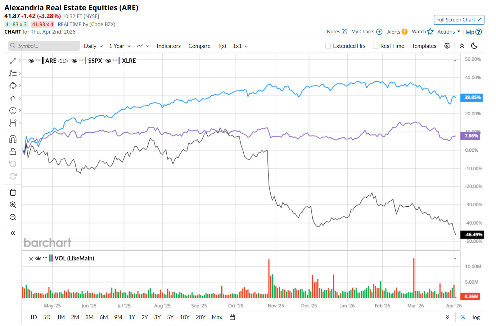 ARE has declined 55% over the past 52 weeks, significantly trailing both the S&P 500 Index's ($SPX) 16.7% return and the State Street Real Estate Select Sector SPDR ETF’s (XLRE) 3% drop over the same time period.