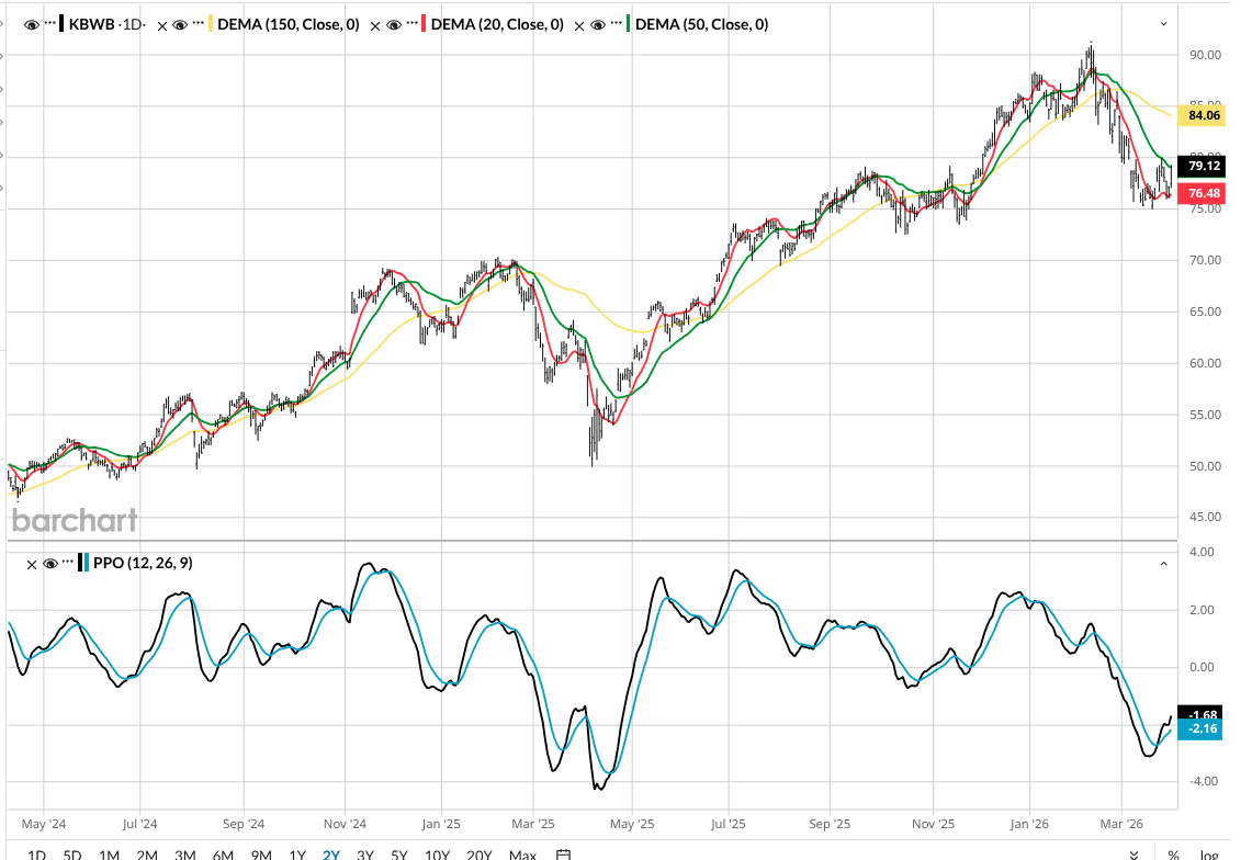Next up is the Invesco KBW Bank ETF (KBWB). It owns the large-cap bank stocks. It's also trying to rally, as you can see from this similar chart.