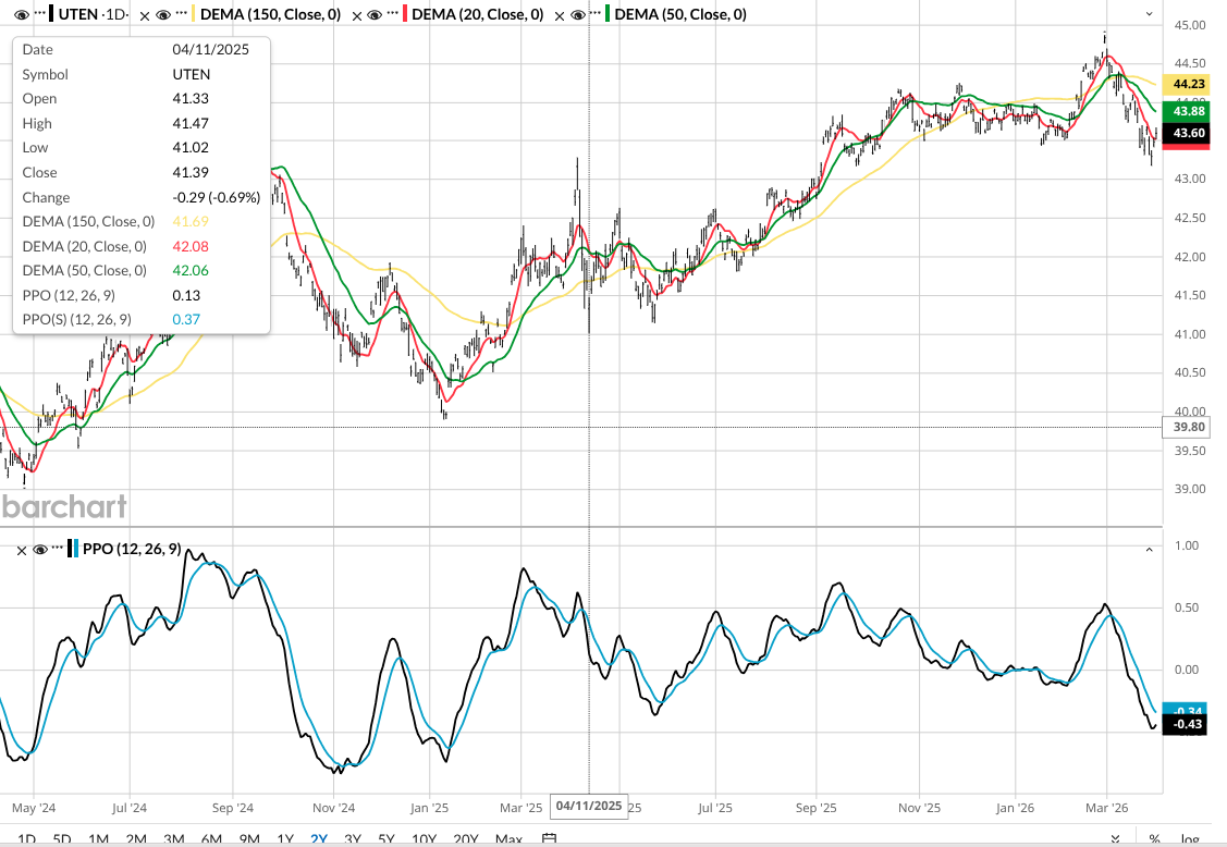 This chart below explains it all. It is the U.S. Treasury 10 Year Note ETF (UTEN), which tracks the price of the 10-year U.S. Treasury bond. If we focus on the right side of this chart, and compare it to the three above, guess what? It's hard to tell them apart. That’s my point. Financial stocks might be preparing to rally, but they are simply following the bond market.