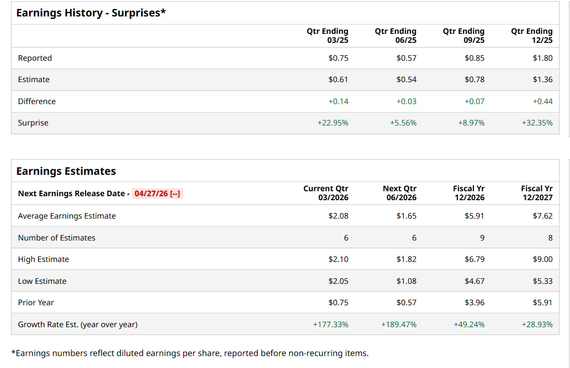 Ahead of this event, analysts expect this tech company to report a profit of $2.08 per share, up 177.3% from $0.75 per share in the year-ago quarter. The company has topped Wall Street’s earnings estimates in each of the last four quarters. In Q4 2025, TER’s EPS of $1.80 handily outpaced the consensus estimates by a notable margin of 32.4%.
