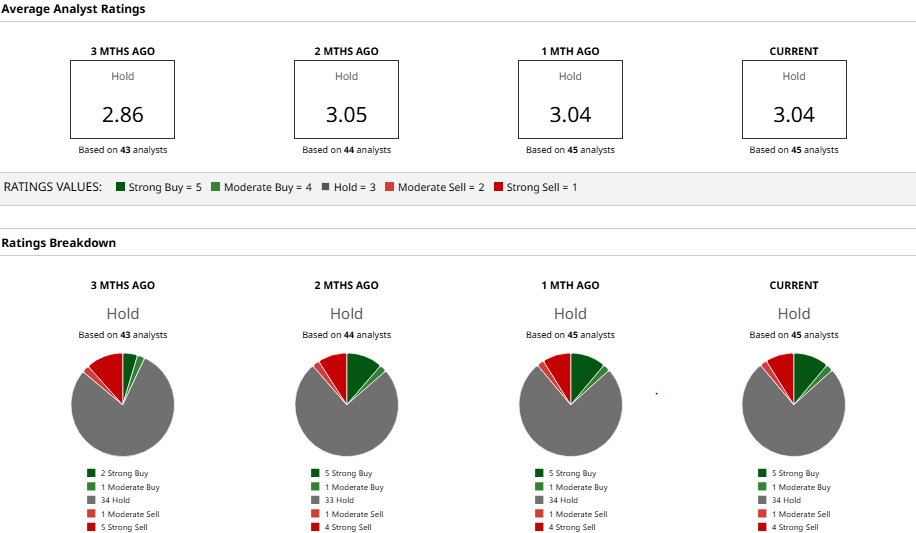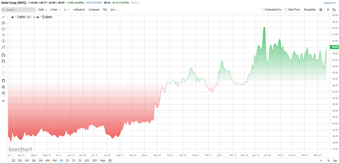 Overall, according to Barchart, the consensus rating among 45 analysts is a “Hold.” The average 12-month price target is $45.26, which INTC stock already surpassed recently and is now moving towards its street high target of $66, which is about 34% above the current levels.